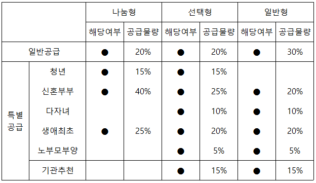 나눔형은 신혼부부에게 40%, 선택형은 생애최초구입자에게 20%, 일반형은 일반공급에 30%의 물량이 배정되어 있다.
