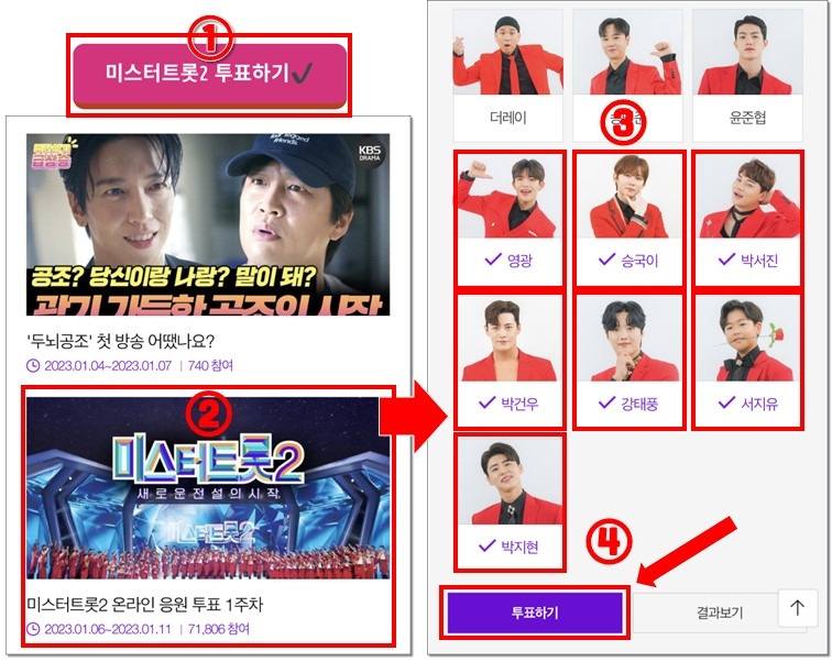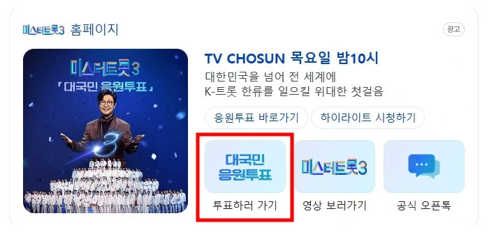 1. 네이버 또는 다음 포털 접속에서 '미스터트롯3' 검색에서 투표하러 가기 클릭