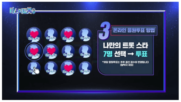 - 모바일 투표 : 스마트폰에서 공식 앱을 다운로드한 후, 회원가입을 하고 응원하는 참가자를 선택하여 투표할 수 있습니다.