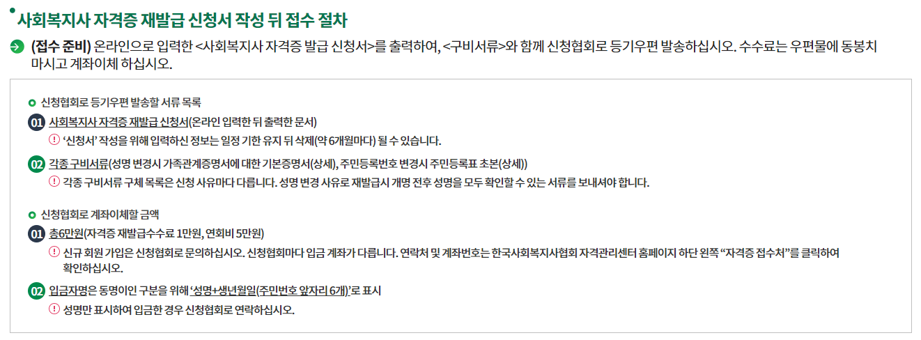 홈페이지에서 회원가입 > 증명사진 등록 > 주소 및 인적사항 작성 > 재발급 제출완료 > 사회복지사협회 전화로 재발급문의 > 수수료 1만 원 입금 > 우편으로 사회복지사자격증 도착