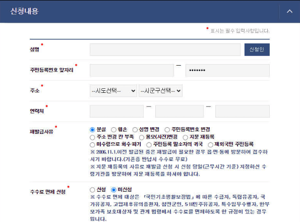 2006년 이전에 발급된 주민등록증 재발급과 지문 재등록의 경우에는 온라인으로 접수할 수 없고 방문접수만 가능하다. SMS로 수령 안내 메시지 서비스를 신청할 수도 있다.